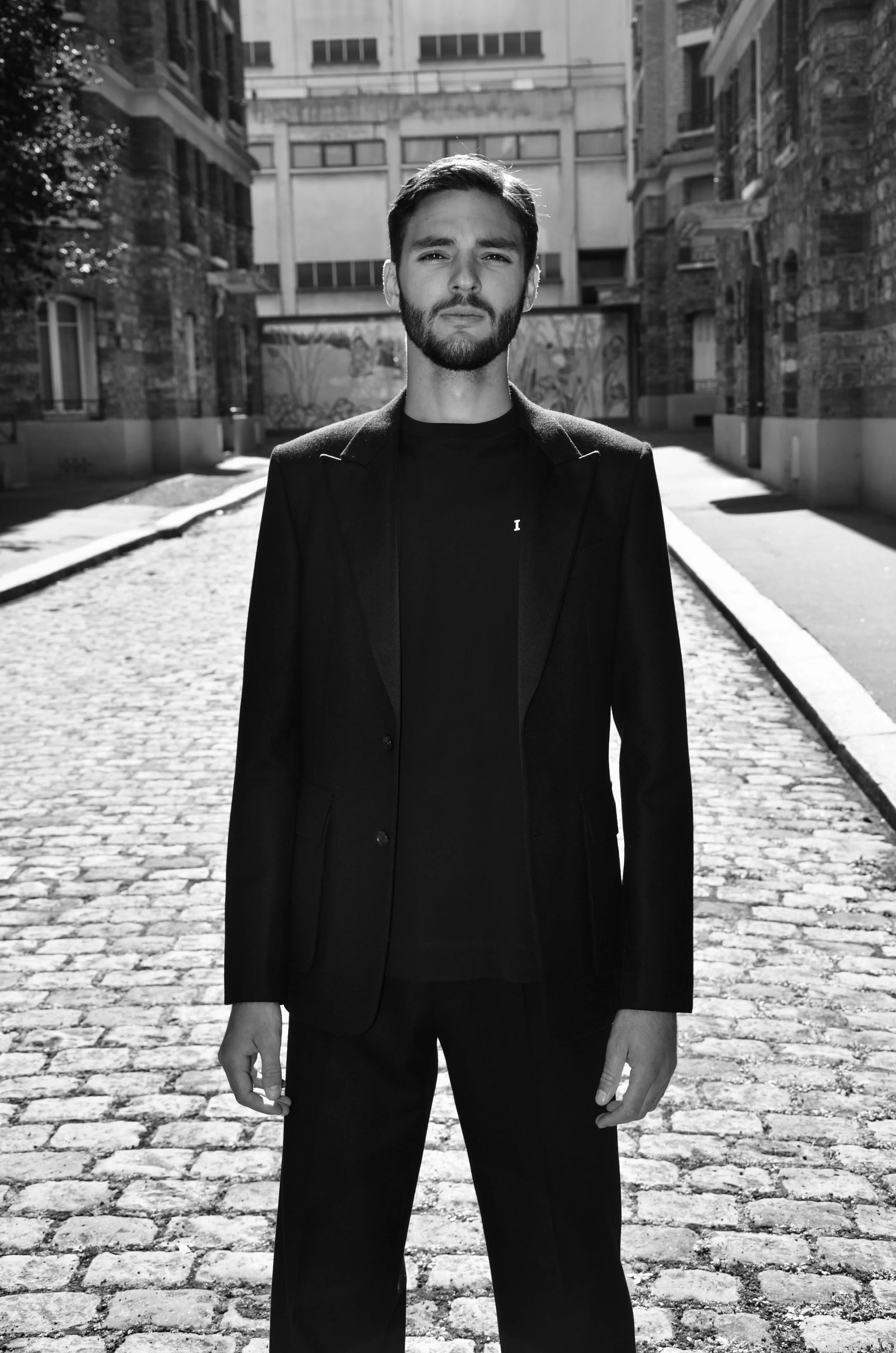 Un homme en costume noir se tient dans une rue pavée, entouré de bâtiments en briques, sous une lumière en noir et blanc.