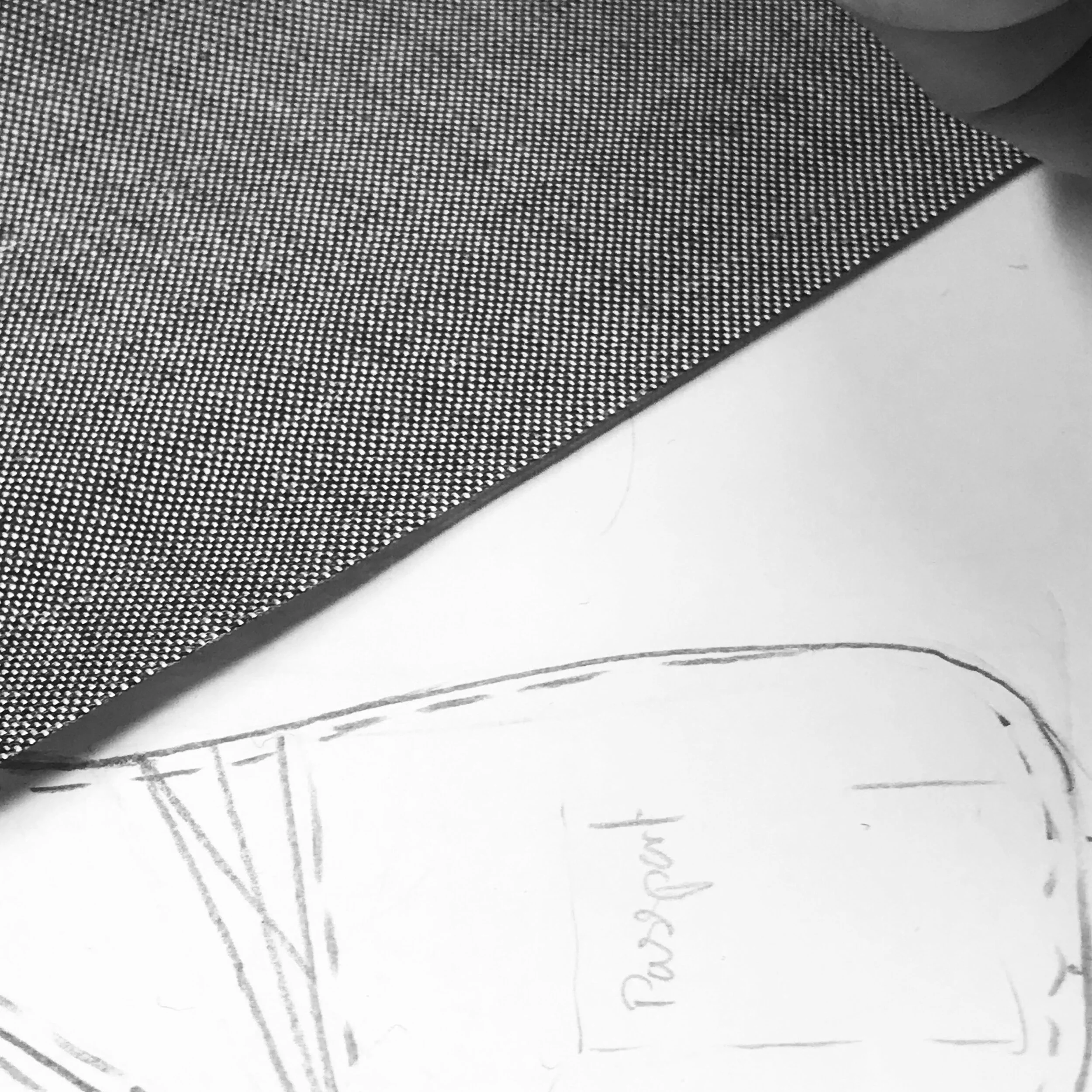 Croquis dessinés sur papier avec un morceau de tissu texturé, étiquette "passeport" visible à côté.